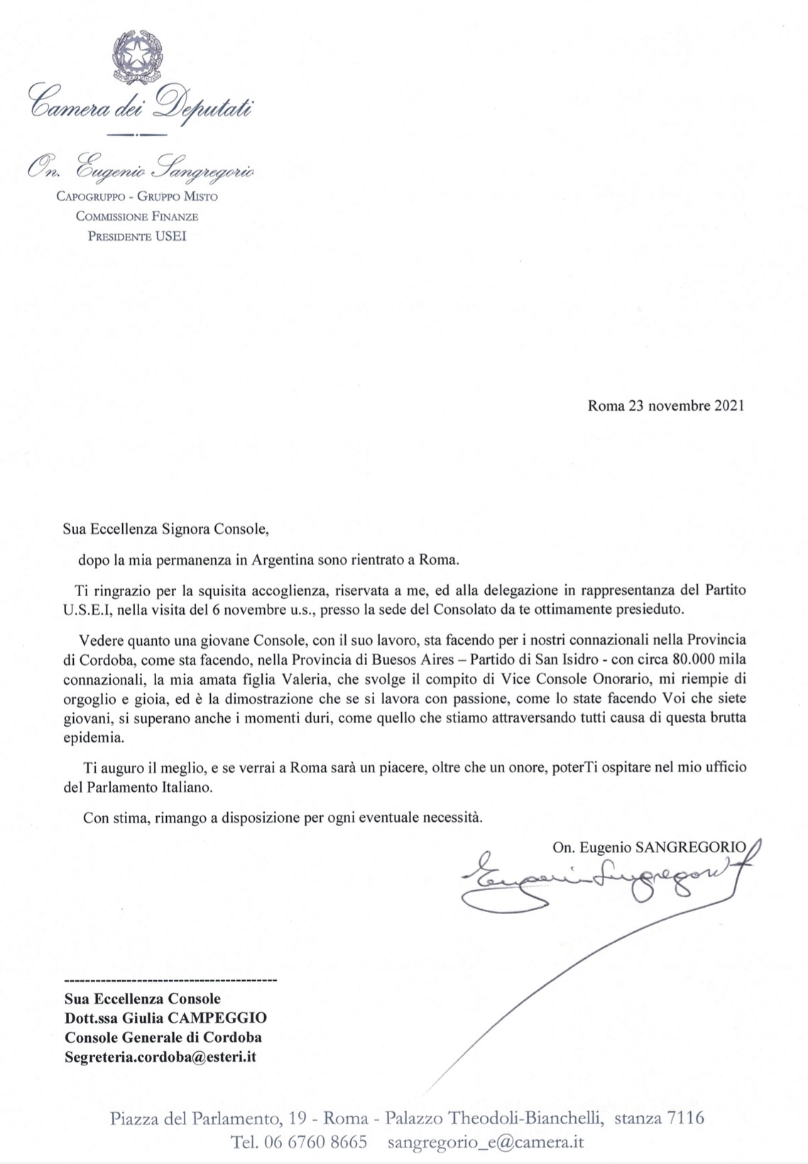 El Onorevole Eugenio Sangregorio se sintió muy honrado con el recibimiento de la Cónsul General, Giulia Campeggio, donde pudieron hablar acerca de las necesidades de los Ciudadanos italianos en Argentina, todas las gestiones que se realizan en el Consulado, y cómo se están optimizando gracias a su gran labor.